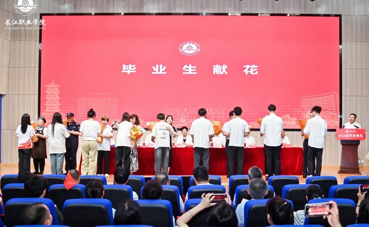 典礼延续着长江职院特有的温情传统,温暖而动人。当毕业生手捧鲜花走向典礼台侧,整个会场响起经久不息的掌声。那里站着三年来守护他们平凡日常的“重要他人”——宿管王阿姨接过鲜花时,眼含热泪,她深情地说:“宿舍的灯光会一直为你们点亮,欢迎随时回家!”。保安队长老陈挺直微驼的背脊,指节粗大的手微微发颤,但他眼神坚定,轻声叮嘱:“走出校门也要记得遵守交通规则,平安才是人生最快的路”。食堂张师傅眼眶也微微泛红,哽咽地说:“以后不管再忙,学校食堂永远会有你的热汤面。”