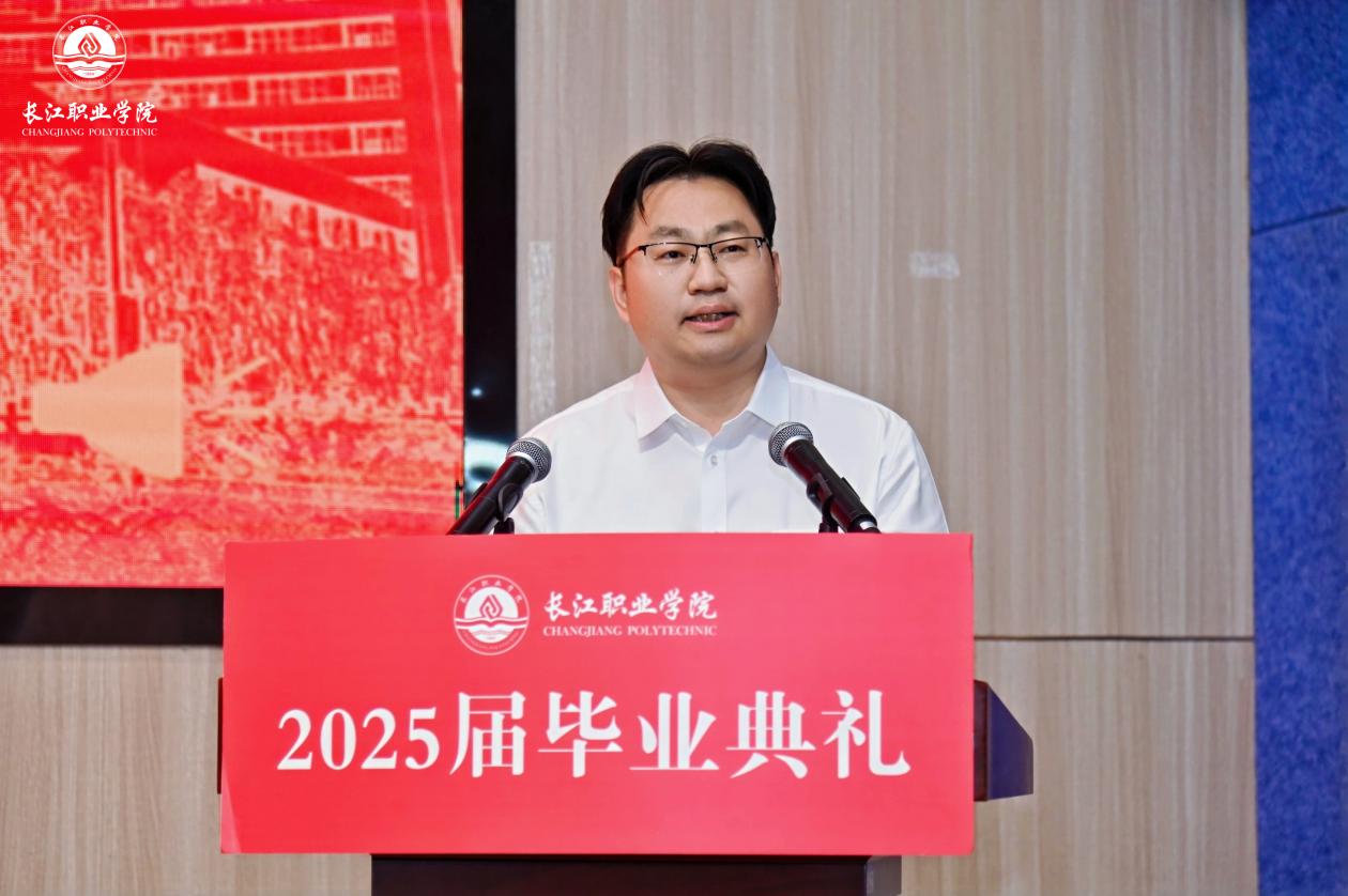 讲话中,校长崔锋以“长江精神”诠释了成长哲学,并送出了四句箴言,犹如四把钥匙,为毕业生们开启了通往未来无限可能的想象之门。一是“格局要大”,他将个人成长与民族复兴同频共振,寄语毕业生莫为眼前风浪所困,当以"不畏浮云遮望眼"的眼界,将青春轨迹镌刻在社会主义现代化强国的壮阔征程中。二是“功夫要深”,他勉励学子传承劳模精神,用浸透机油的双手、敲击代码的指尖,在平凡岗位书写"致广大而尽精微"的答卷。三是“行动要快”,他引用"纸上得来终觉浅"的古训,号召毕业生以"手上有活"的勤勉、"心中有光"的坚守,让青春在基层沃土绽放异彩。四是“承压要强”,他教诲学子效法江中砥柱,在"千淘万漉"中沉淀智慧,将每次挫折转化为向上攀登的支点,终将吹尽狂沙见真金。