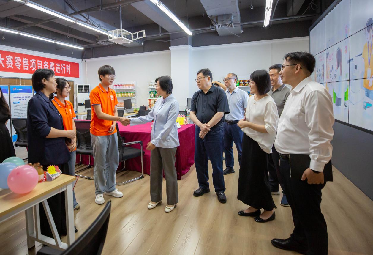 移步至零售赛项训练区,现场模拟销售模块训练正紧张进行。李述永驻足观看选手舒家俊、张书琴的演练后,给出了极具启发性的指导:“销售的本质,不仅仅只是商品的简单交易,它更深层次地关乎情感的联结与文化的传递。”她以武汉标志性美食热干面为例,生动阐释:“要推介好热干面,就不能只停留在口味描述上。要挖掘并讲述它所承载的武汉独特的市井烟火、抗疫精神以及深厚的历史文化底蕴;要让产品‘会说话’,把它背后的故事、融入的情感、代表的文化,有效地传递给顾客,这样才能真正打动人心,提升销售的价值内涵。”她特别强调,要将“文化赋能”的理念融入技能实践。