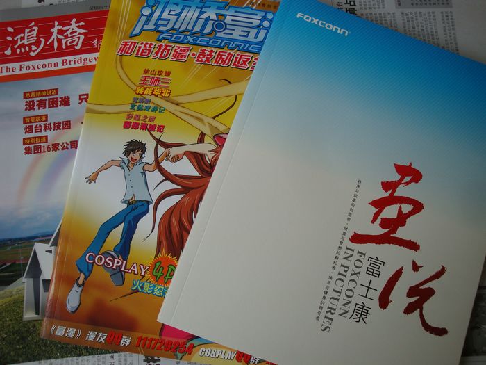 富士康十分重视企业文化建设,集团报纸、期刊、网站、电视及摄影协会、舞蹈协会等一应俱全。图为集团的漫画等期刊
