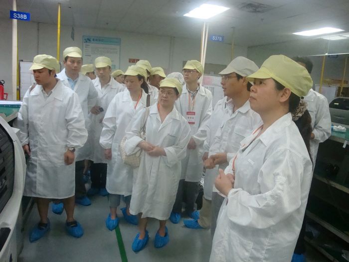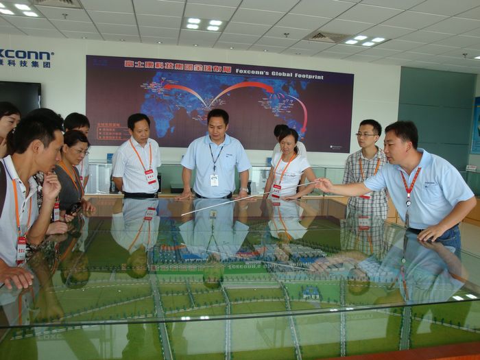 我校考察团来到后,受到富士康集团高层领导热情接待。在集团领导的陪同下,考察团参观了富士康的生产区、办公区和员工生活区(食堂、宿舍、文化活动室等),并在集团会议室举行了座谈会。考察团听取了武汉科技园区的发展历程、规模、企业文化、员工待遇等介绍,并就如何建立我校学生顶岗实习基地、开展订单培养、校企深度合作等进行了初步交谈,希望富士康在长江职业学院的建设发展、学生就业和人才培养等方面提供大力支持。