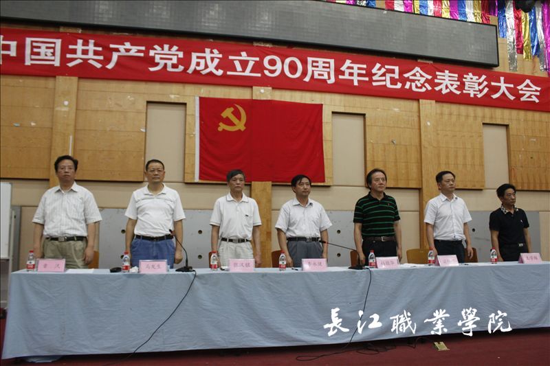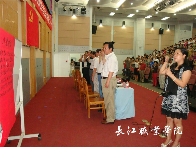 大会在雄壮的国歌声中开始。党委副书记兼纪委书记张汉铭宣读了《长江职业学院关于表彰2010—2011年度先进基层党组织和优秀共产党员、优秀党务工作者的决定》,副校长杨敬华同志宣读了《关于批准吕国望等166名中共预备党员按期转正和刘丹等241名同志为中共预备党员的通知》。全体新党员在党旗下庄严宣誓,老党员重温入党誓词。