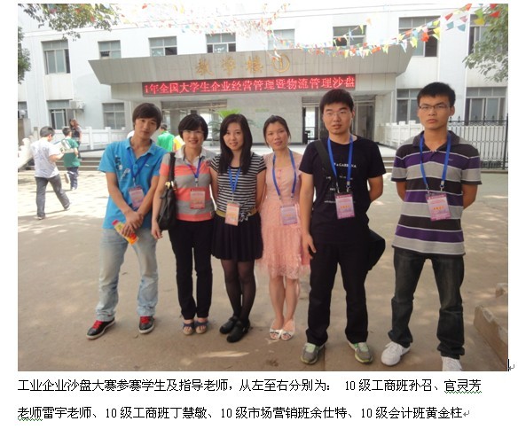 本网讯 (特约通讯员 官灵芳)6月1日,2011年全国大学生企业经营管理暨物流沙盘大赛湖北赛区比赛在湖北交通职业学院举行,我校10级工商企业管理专业的孙召、丁慧敏、会计专业的黄金柱及市场营销专业的余仕特4名学生组成的团队在工业企业电子沙盘比赛中获得三等奖; 09级物流管理专业熊建军、武爽爽、蒲娜娜、黄亚林4名同学组成的团队在物流电子沙盘比赛中获得了优胜奖。