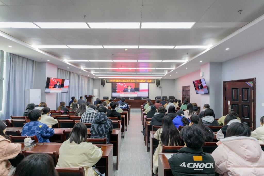 本网讯 12月4日是第11个国家宪法日。为在校园营造学习宪法、尊崇宪法的良好氛围,进一步推进宪法法治教育,根据省教育厅关于开展2024年“宪法宣传周”系列活动的工作安排,12月4日上午9:00,学校组织师生代表在武汉新城校区上善楼806会议室和光谷校区明德楼920会议室集中观看2024年教育系统“宪法晨读”活动直播。