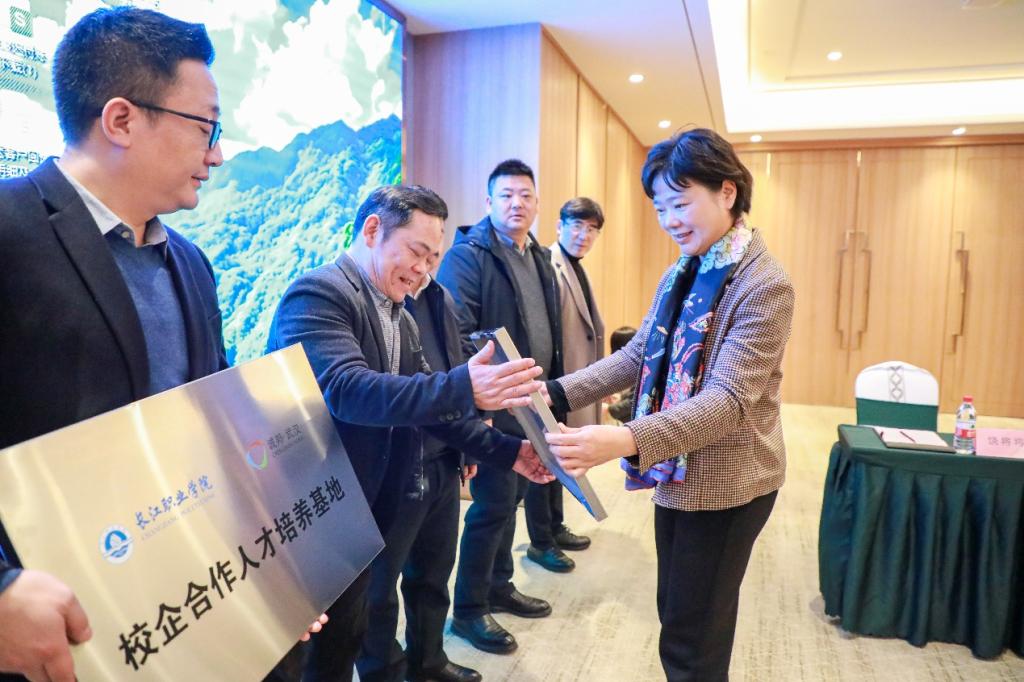 校企战略合作授牌仪式上,童静菊代表学校向武汉诚邦集团、湖北易游天下国际旅行社有限公司、世旅控股集团(武汉)有限公司、湖北楚粤通生物科技有限公司、湖北画报社有限公司、湖北红海人力资源有限公司等湖北部分校友企业授予了“校企合作人才培养基地”牌匾,标志着双方在人才培养、实习就业等方面的合作迈入了新的阶段。