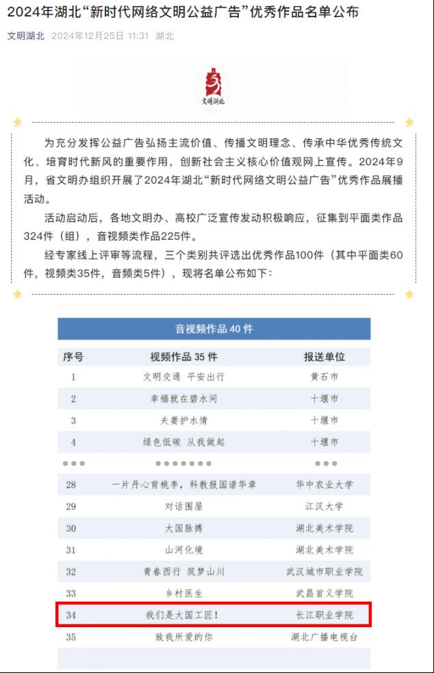本网讯 近日,由湖北省文明办组织开展的2024年湖北“新时代网络文明公益广告”优秀作品名单公布,长江职业学院选送的作品《我们是大国工匠!》获评音视频类优秀作品。