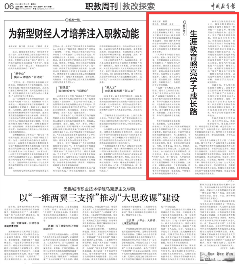 本网讯 2024年12月31日,《中国教育报》职教周刊(第06版)刊发以《生涯教育照亮学子成长路》为题的文章,报道长江职业学院系统化全周期的生涯教育培养的做法与特色。