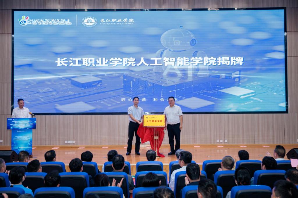 湖北省教育厅职业教育与成人教育处副处长张兵、长江职业学院党委副书记张俊为人工智能学院揭牌
