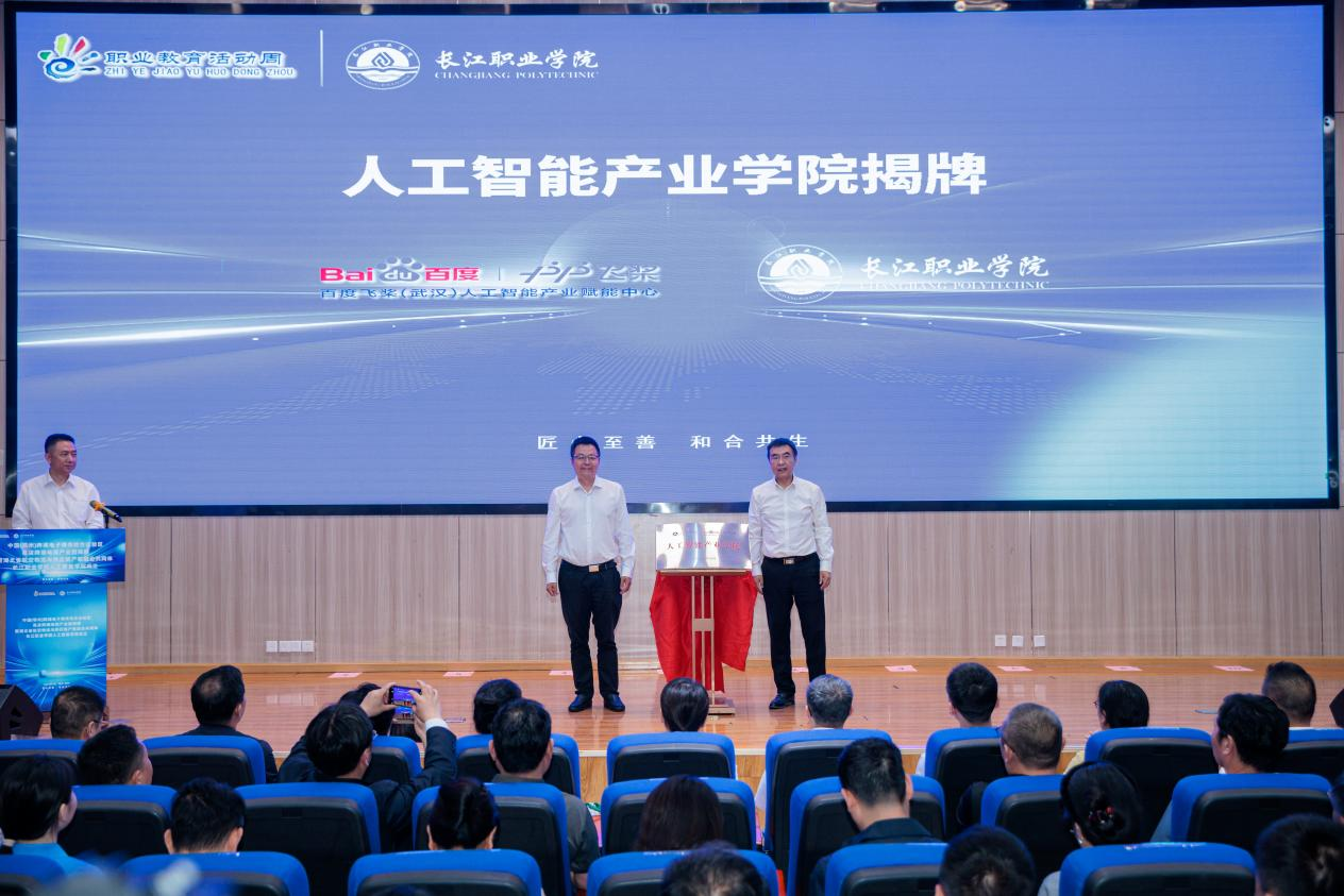 百度飞桨(武汉)人工智能产业赋能中心总经理任勇、长江职业学院党委委员黄朝晖为人工智能产业学院揭牌