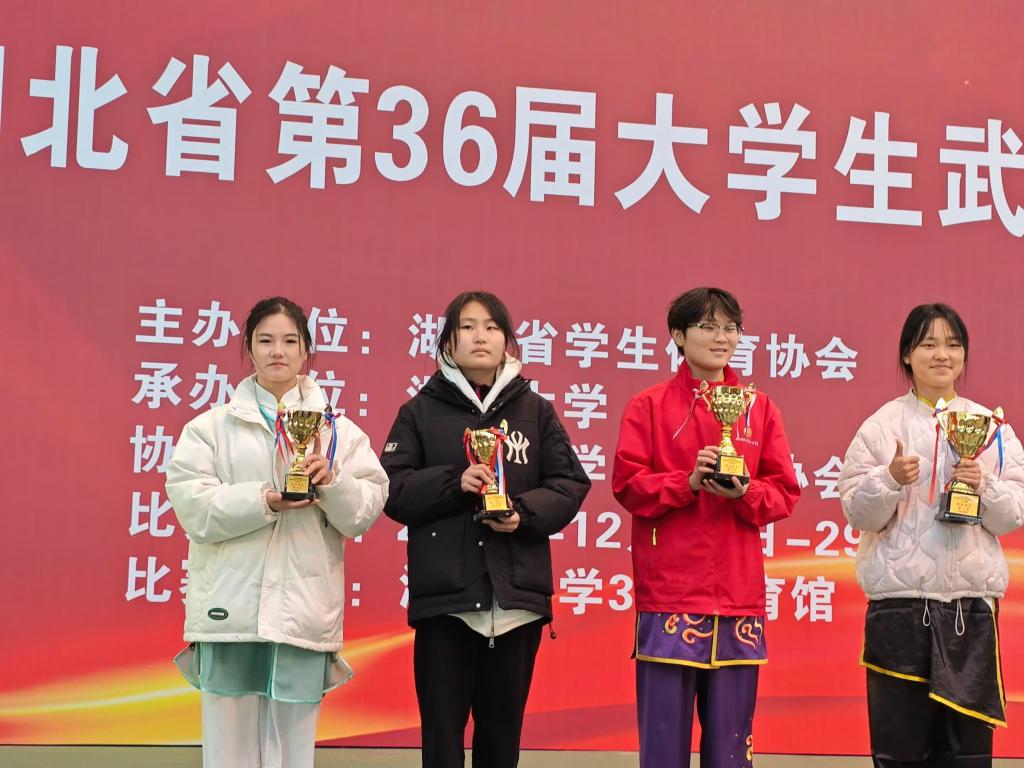 本次赛事由湖北省学生体育协会主办,吸引了来自全省46所高校的500余名运动员参与,竞争异常激烈。我校武术队在指导教师孙敏、彭丹的带领下,派出8名学员参与1个集体项目和2个单项的比赛。其中,8位学员共同演练的集体24式太极拳荣获一等奖,花湖临空经济学院的杨志鑫荣获男子24式太极拳第二名,文化教育学院的梅剑、廖丽媛分别获得女子24式太极拳第二名和第三名,女子团体排名位居全省第七。