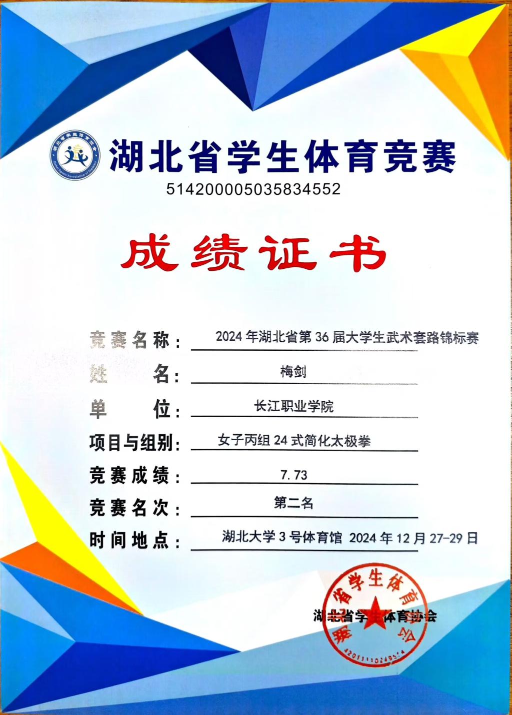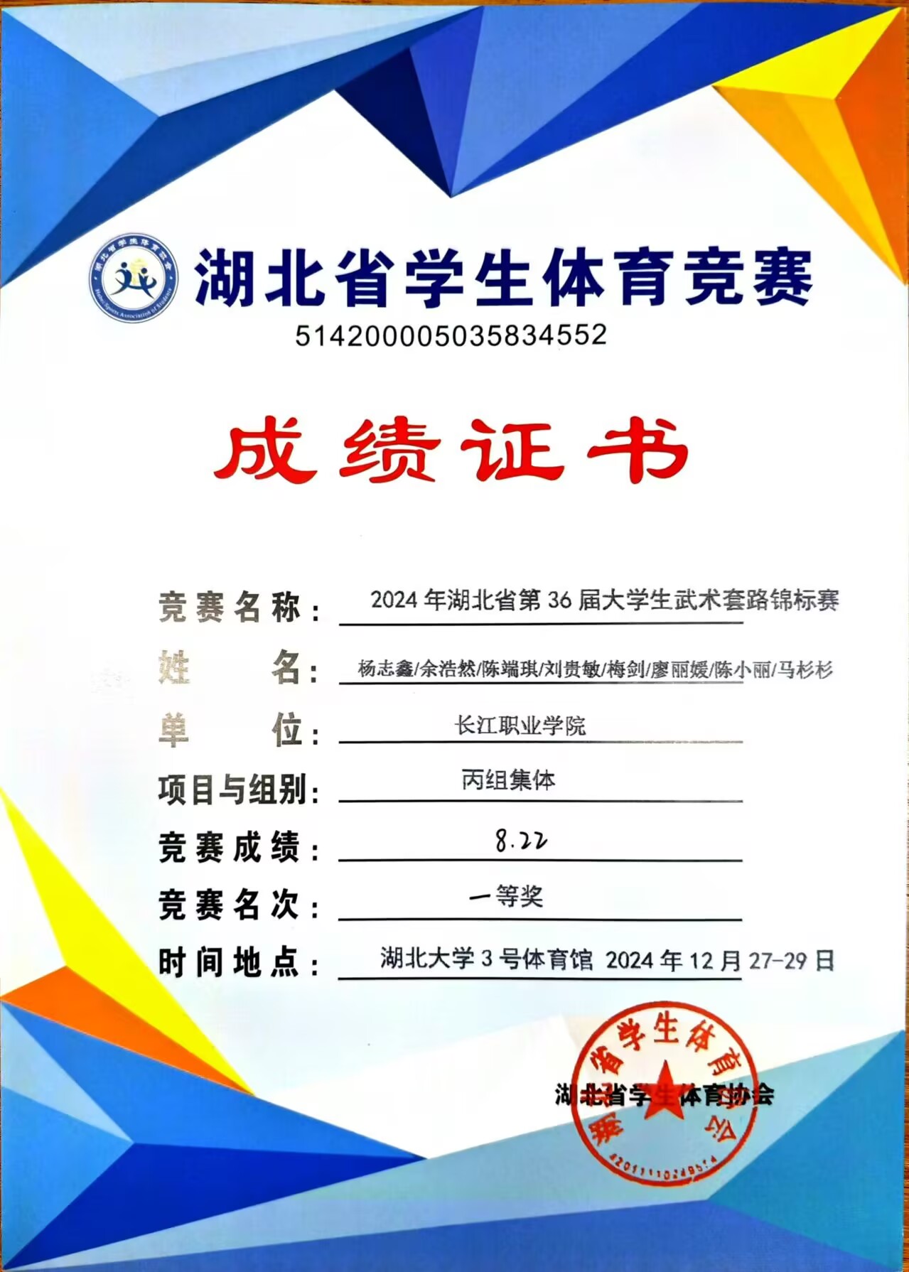 本网讯 近日,在湖北省第36届大学生武术套路锦标赛中,长江职业学院武术队以卓越的表现勇夺集体一等奖及2个单项第二名、1个单项第三名的佳绩,为学校体育教学工作再添辉煌。