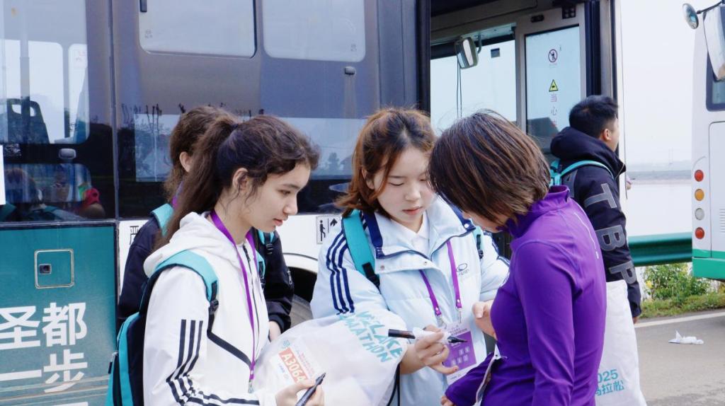 “这是您的参赛包,祝您跑出好成绩!”在存衣处,维吾尔族姑娘卡地尔也·吐孙用双语服务赢得跑者点赞。她与8名少数民族志愿者组成的“石榴籽服务岗”,不仅实现零差错物品管理,更用民族歌舞为候场区增添别样风景。志愿服务的短暂休息间隙,面对好奇的跑者,卡地尔也·吐孙笑着说道:“我来自新疆,我的名字寓意为‘珍惜’。”这短短一句话便道出了她对待志愿服务的初心与态度。