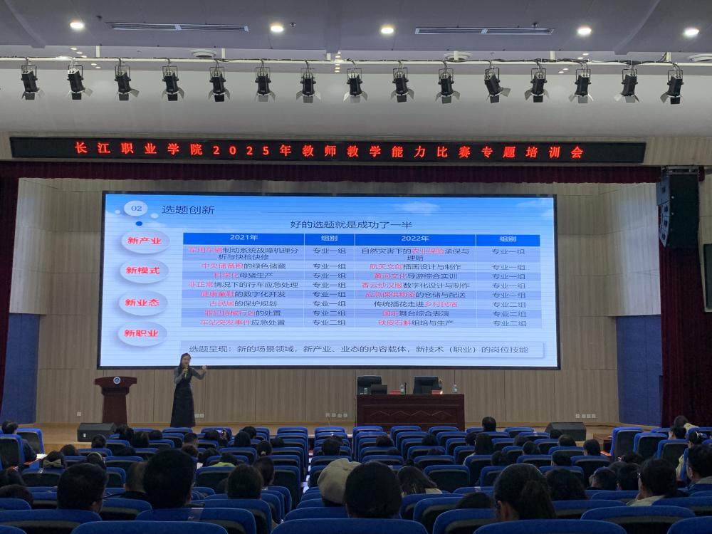 本网讯 4月1日下午,长江职业学院正式启动2025年教师教学能力比赛备赛专题培训,首场培训在武汉新城校区报告厅举行。本次培训邀请两度斩获全国职业院校教师教学能力大赛国家一等奖的安徽商贸职业技术学院马静教授担任主讲嘉宾。各二级学院院长、教学副院长及全体专任教师悉数到场参训,培训会由教务处处长平怡主持。